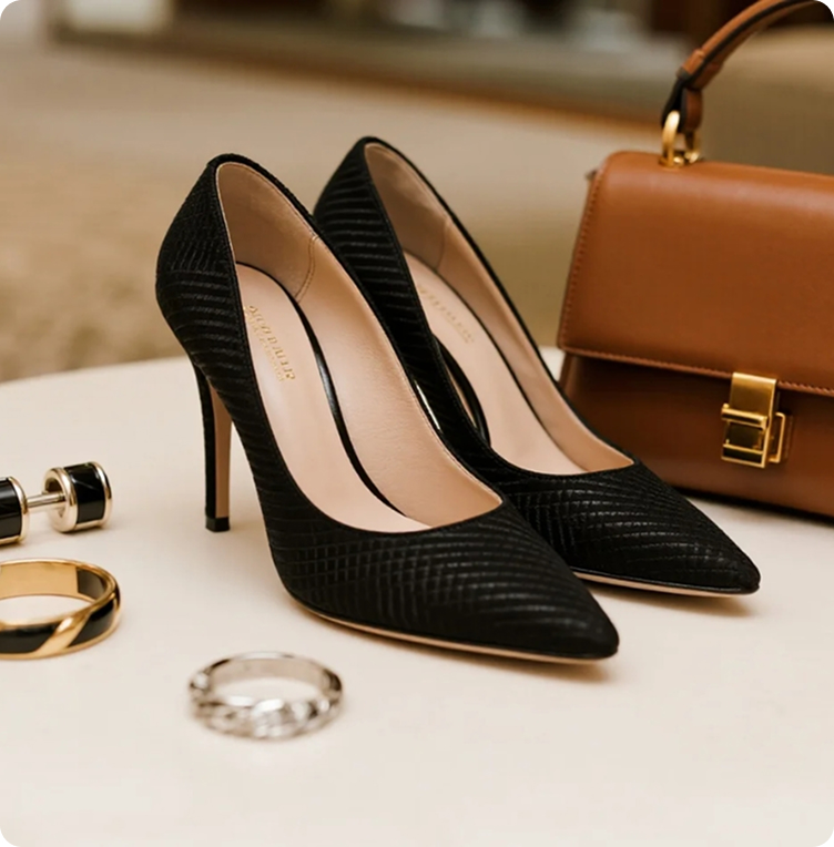 运动鞋、帆布鞋、乐福鞋、豆豆鞋、拖鞋、皮鞋、高跟鞋、凉鞋、马丁靴、雪地靴、雨靴、工装靴、登山鞋、劳保鞋、手提包、单肩包、双肩包、托特包、公文包、斜挎包、背包、手拿包、腰包、行李箱、电脑包、母婴包、运动包、旅行包、项链、耳环、手链 / 手镯、戒指、胸针、脚链、帽子、围巾、手套、袜子、腰带、眼镜、手表、发饰、钥匙扣、挂饰等。